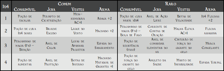 Além disso, nessa sessão o grupo encontrou um item mágico aleatório. Preparei uma tabela com diversas opções e sorteamos ao vivo durante o jogo se: