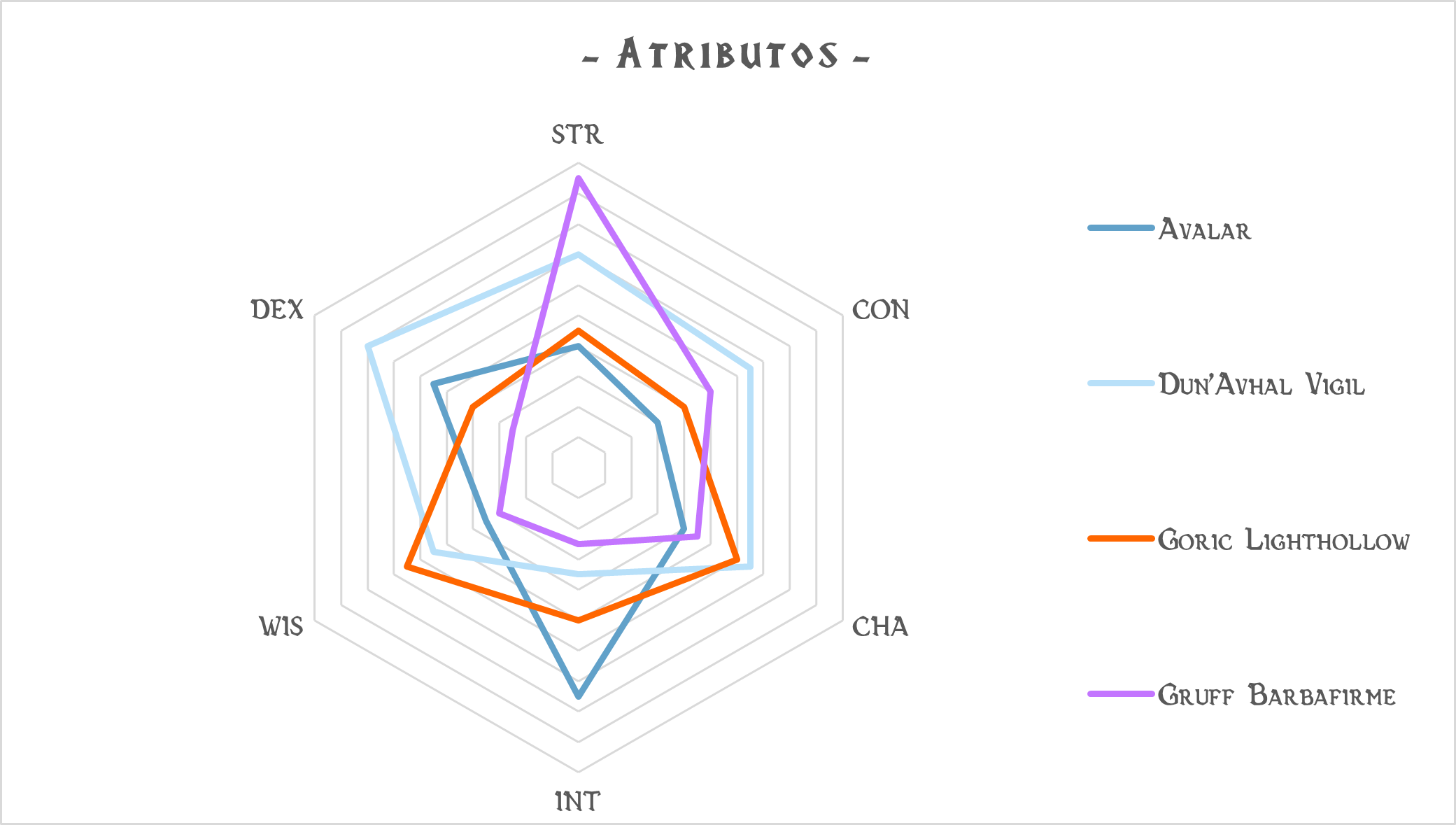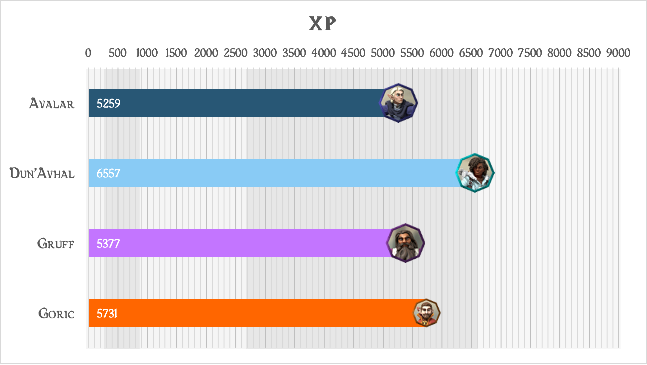 XP da Equipe até aqui (lembrando que esses personagens foram reaproveitados da nossa última oneshot e já começaram no 4º nível) Destaque para Dun’Avhal que por 43 pontos não atingiu o Level 5 (que é alcançado com 6.600xp).