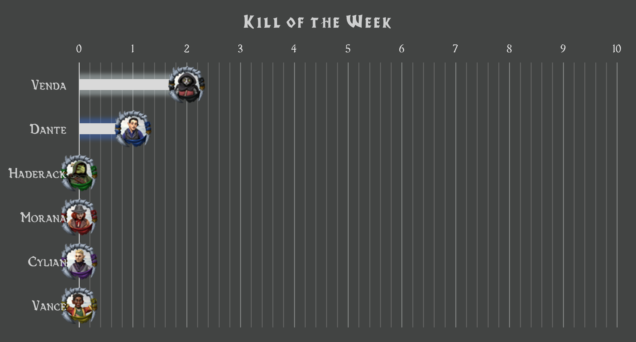 Após votação, o Kill of the Week (valendo +98xp) foi para Venda pela chacina no telhado, matando 3 orcs em sequência.