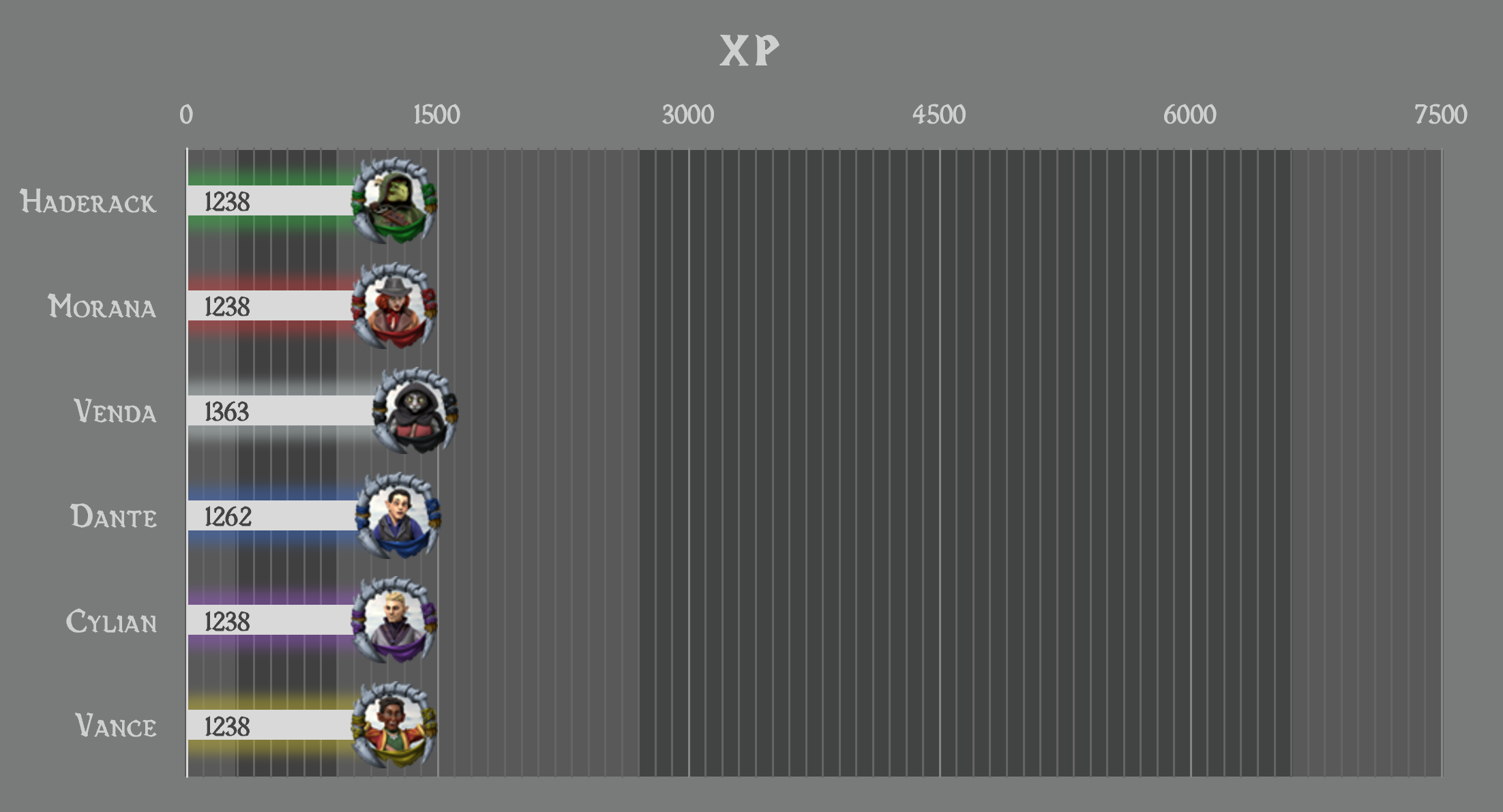 Divididos igualmente pelos 6 integrantes do grupo = 233xp para cada PC. Total final por PC: +533xp.