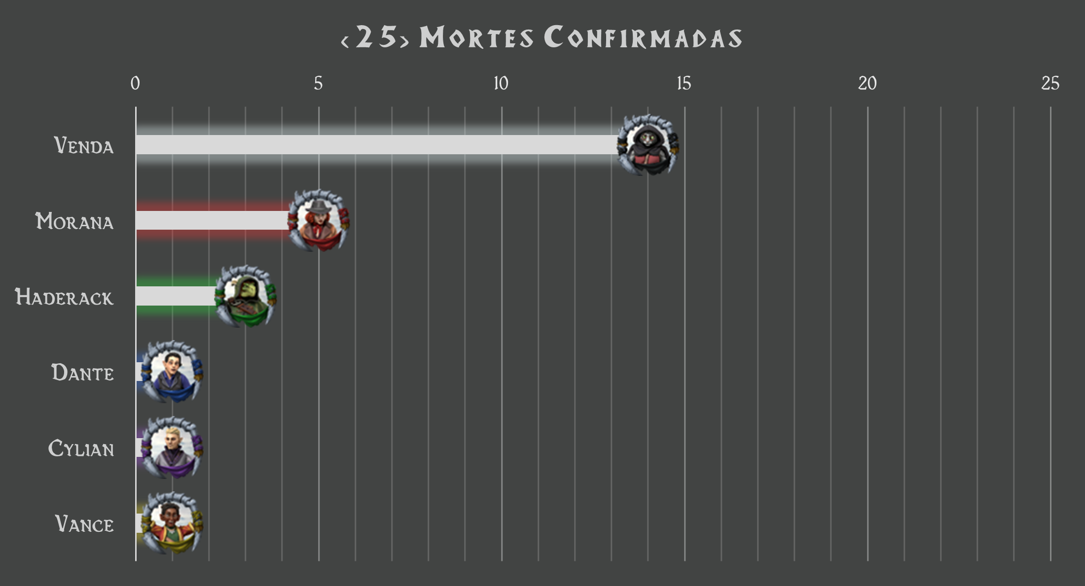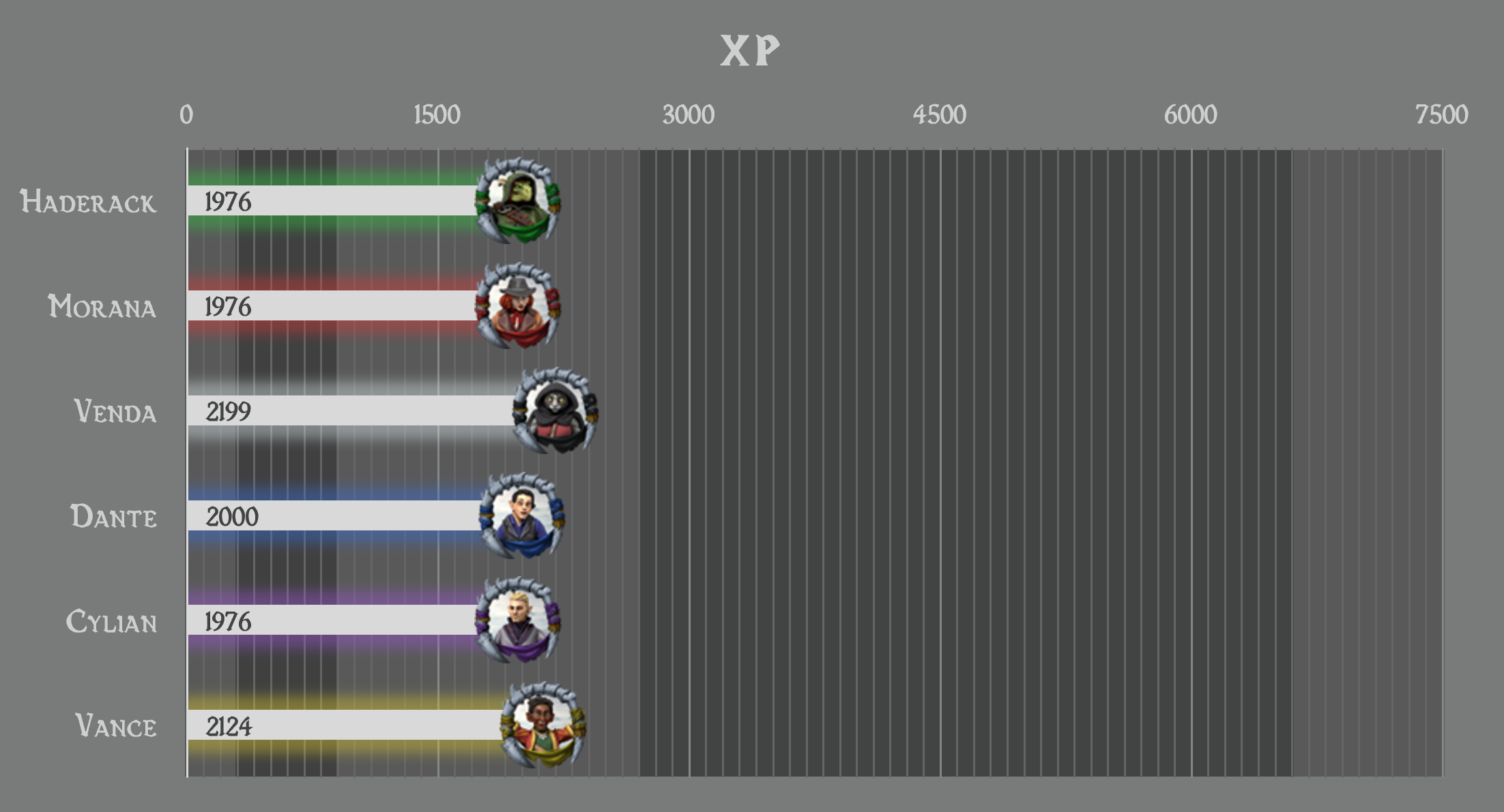 Total = 4.425xp para o grupo; i.e. 738xp cada PC (+148xp KotW para Vance).