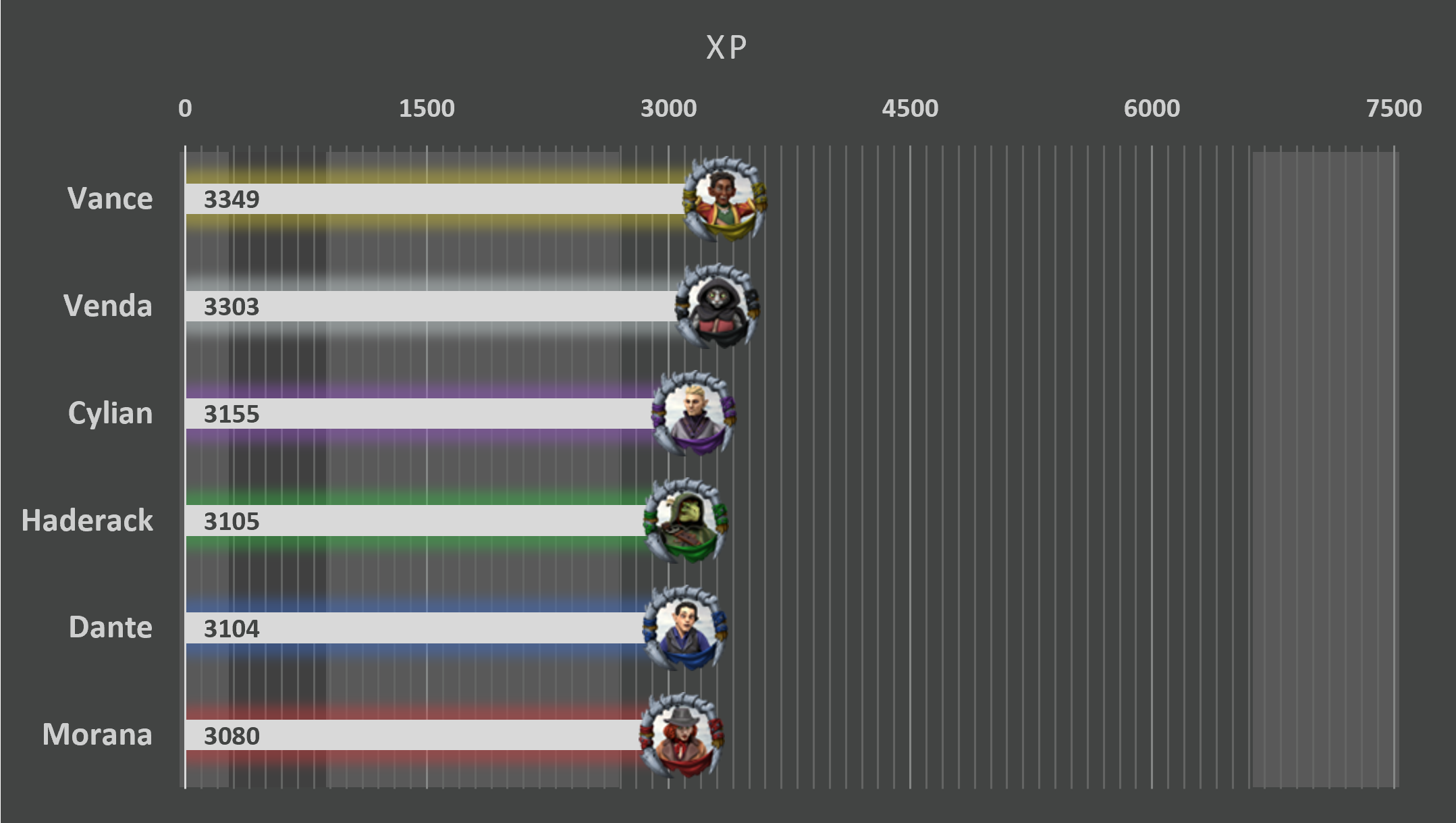 | 3.625xp | Total para o grupo; i.e. 604xp cada PC (+121xp anti-KotW para Vance). |