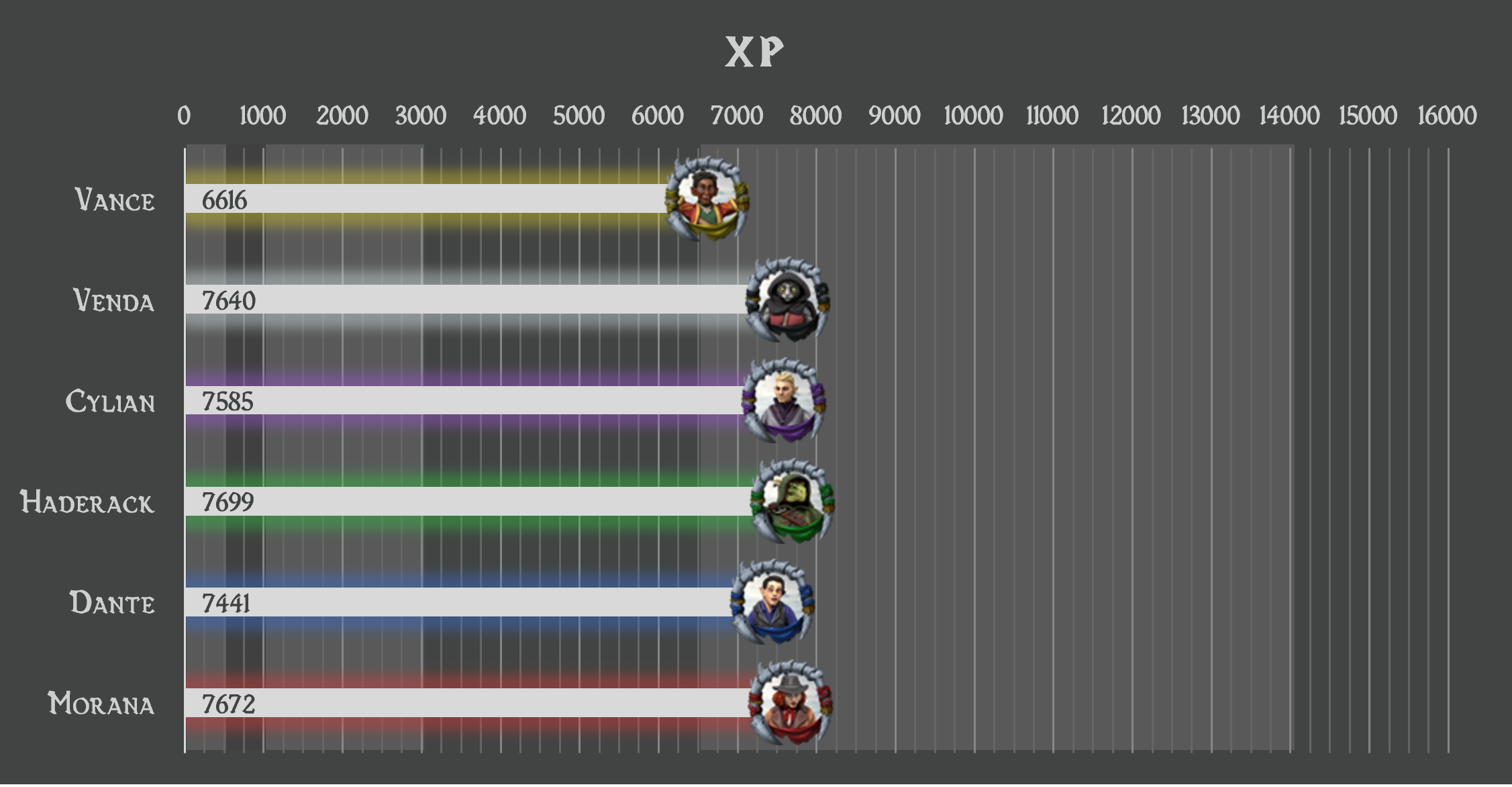 XP da rodada: - 850 = 50 x17 Goblins - 100 = 25 x4 Goblin Skirmisher - 200 = Goblin Blackblade - 200 = Goblin Boss - 200 = Goblin Witch - 450 = Goblin Shaman - 450 = Goblin Alchemist - 1.800 = 450 x4 Ogros Total = 5.350xp para o grupo (exceto Vance que ficou escondido, pois estava à beira da morte); i.e. 1.070xp cada um dos 5 PCs (+214xp KotW para Haderack).